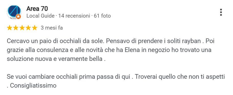 Da Ottica Paffoni, l'attenzione al cliente è il cuore di tutto. Ogni individuo ha esigenze uniche, e per questo offriamo una consulenza personalizzata nella scelta degli occhiali da sole. Grazie a un assortimento ampio di montature e lenti di qualità superiore, creiamo soluzioni su misura che uniscono praticità e design. Il nostro team esperto è sempre pronto a consigliare con professionalità e dedizione, assicurando che ogni cliente trovi il modello perfetto per il proprio stile e comfort. Con Ottica Paffoni, ogni dettaglio è curato per garantire la massima soddisfazione e un'esperienza d'acquisto impeccabile.